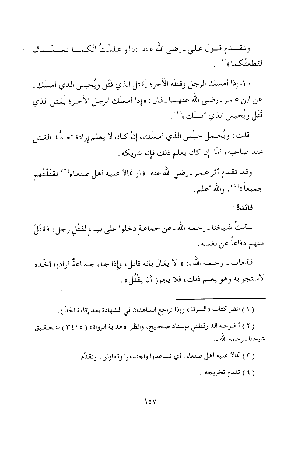 10 - إِذا أمسك الرجل وقتلَه الآخر؛ يقتل الذي قَتَل ويُحبس الذي أمسَك. عن ابن عمر -رضي الله عنهما- قال: "إِذا أمسَك الرجل الآخر؛ يُقتل الذي قَتَل ويُحبس الذي أمسَك" (¬2).