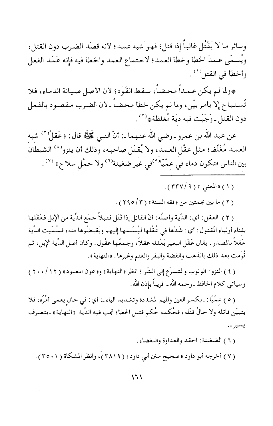 عن عبد الله بن عمرو -رضي الله عنهما-: أنّ النبي - صَلَّى اللَّهُ عَلَيْهِ وَسَلَّمَ - قال: "عَقلُ (¬3) شبهِ العمد مُغَلّظ؛ مثل عقْلِ العمد، ولا يُقتَل صاحبه، وذلك أن ينزو (¬4) الشيطَان بين الناس فتكون دماء في عِمّيّا (¬5) في غير ضغينة (¬6) ولا حمْلِ سلاح" (¬7).