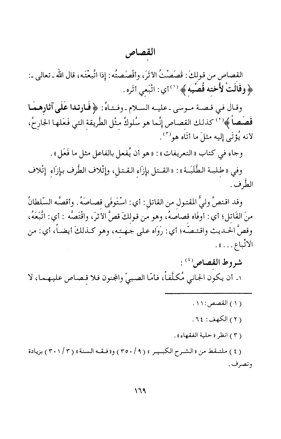 وقال في قصة موسى -عليه السلام- وفتاهُ: {فَارتدا عَلَى آثارِهما قَصَصاً} (¬2) كذلك القِصاص إِنِّما هو سُلوكُ مِثْل الطَّريقةِ التي فَعَلها الجارِحُ، لأنه يُؤتَى إِليه مثلَ ما أتَاَه هو (¬3).