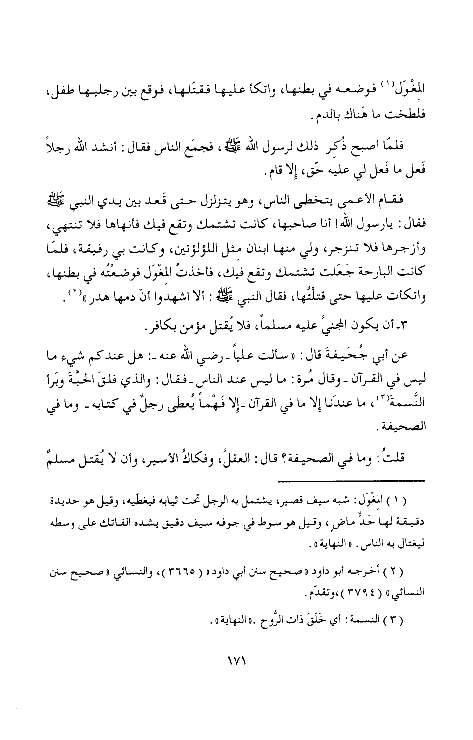 قلتُ: وما في الصحيفة؟ قال: العقلُ، وفكاكُ الأسير، وأن لا يُقتل مسلمٌ