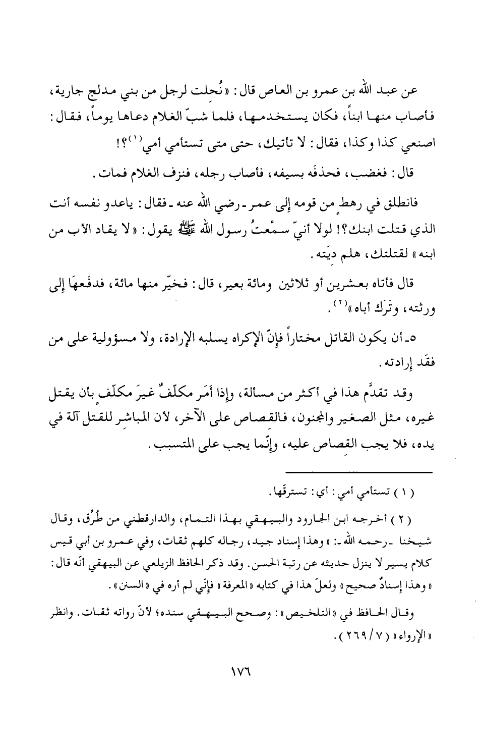 فانطلق في رهطٍ من قومه إِلى عمر -رضي الله عنه- فقال: يا عدو نفسه أنت الذي قتلت ابنك؟! لولا أنيّ سمْعتُ رسول الله - صَلَّى اللَّهُ عَلَيْهِ وَسَلَّمَ - يقول: "لا يقاد الأب من ابنه" لقتلتك، هلم دِيَته.