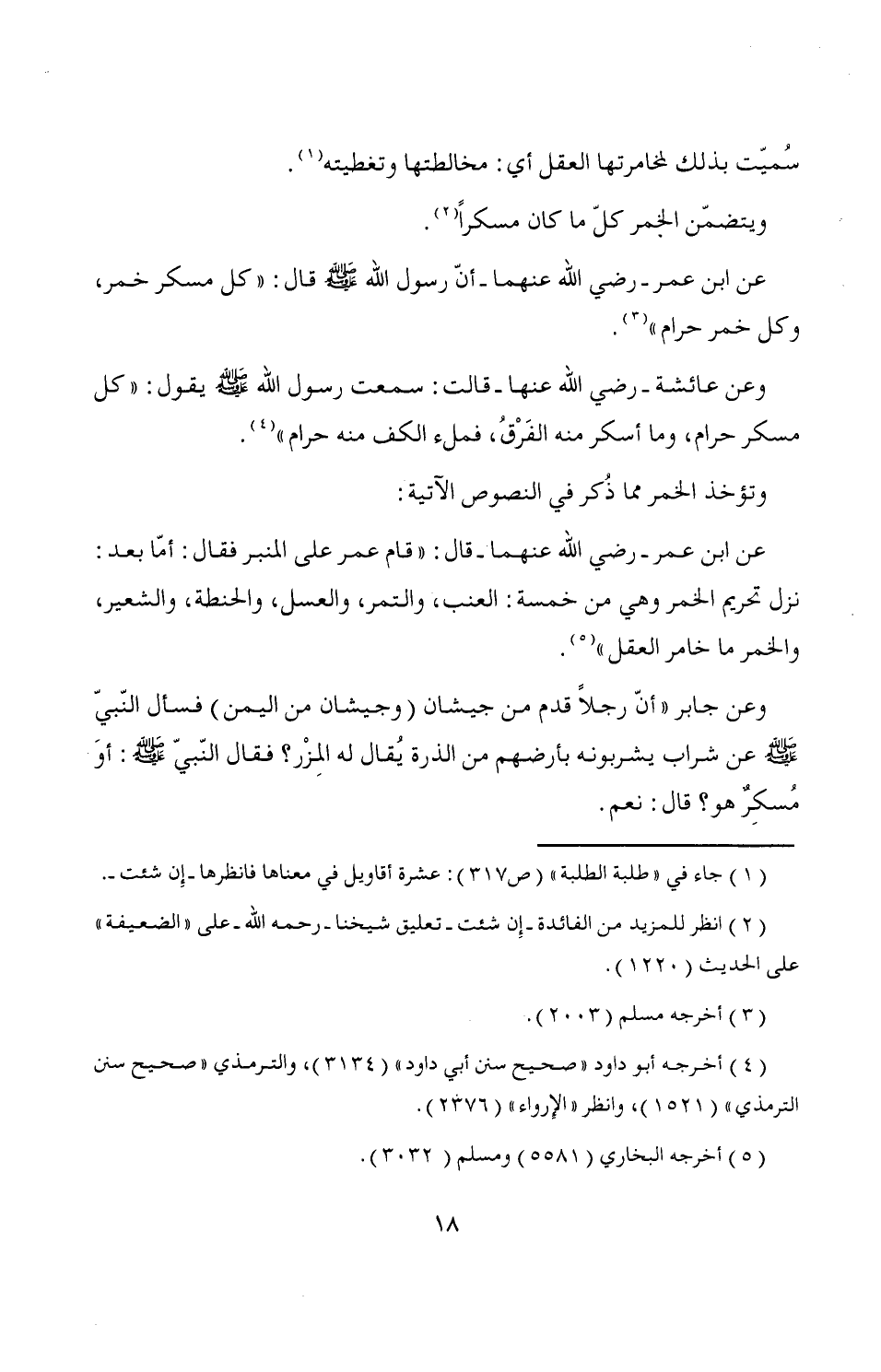 عن ابن عمر -رضي الله عنهما- أنّ رسول الله - صَلَّى اللَّهُ عَلَيْهِ وَسَلَّمَ - قال: "كل مسكر خمر، وكل خمر حرام" (¬3).