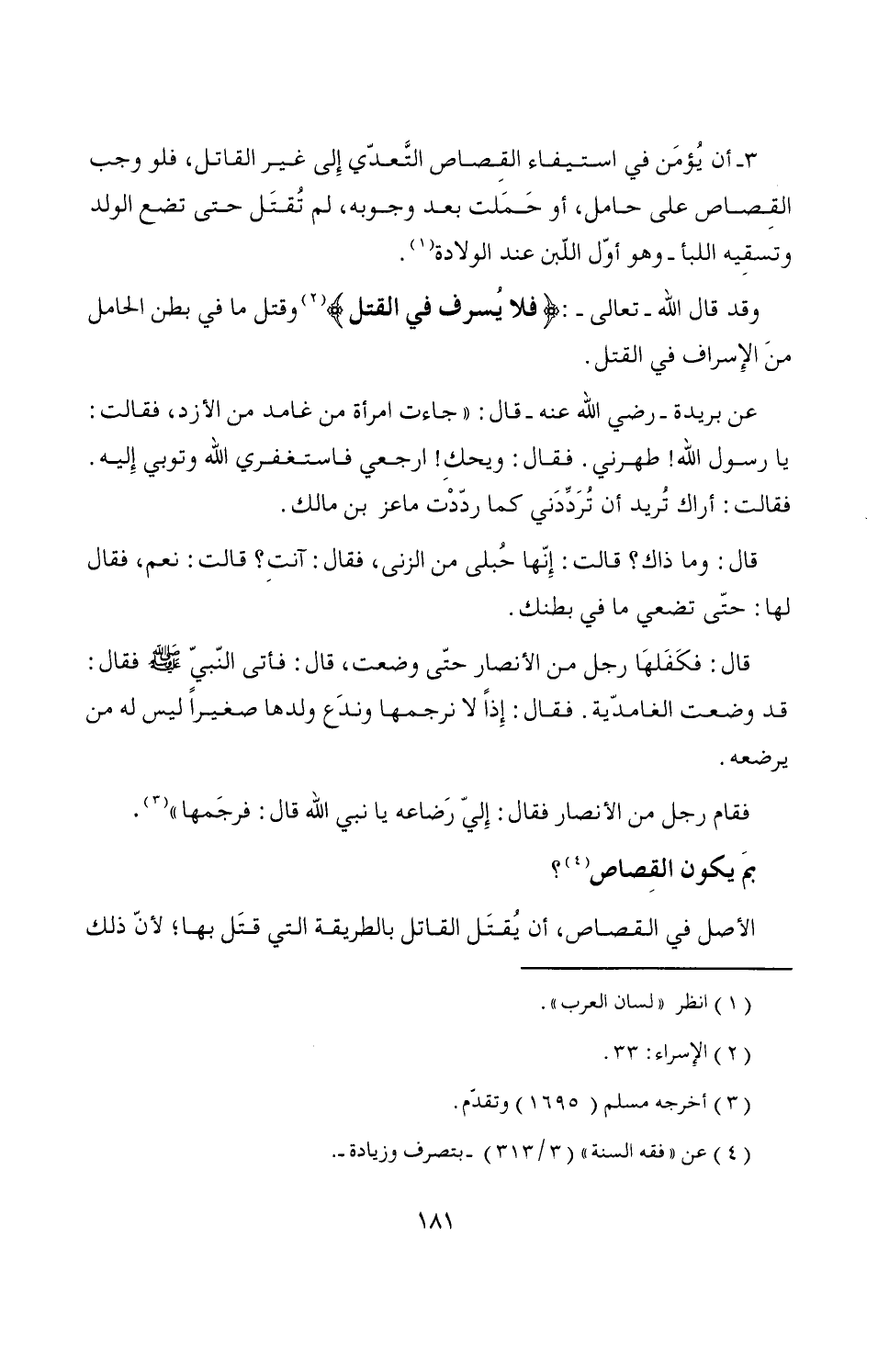 3 - أن يُؤمَن في استيفاء القِصاص التَّعدّي إِلى غير القاتل، فلو وجب القِصاص على حامل، أو حَمَلت بعد وجوبه، لم تُقتَل حتى تضع الولد وتسقِيه اللبأ -وهو أوّل اللّبن عند الولادة (¬1).