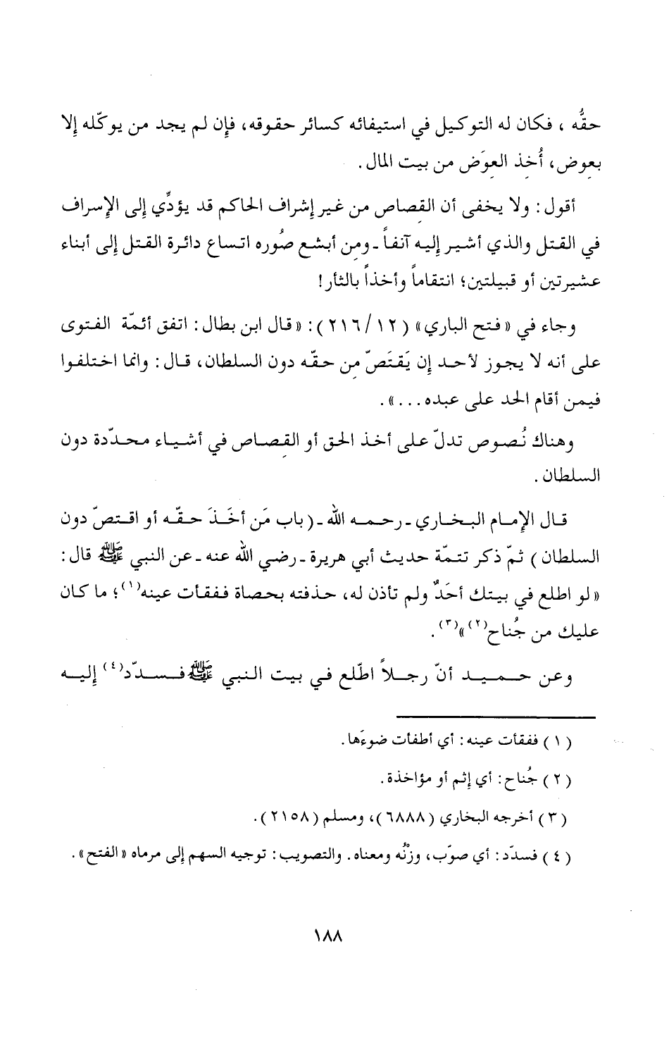 قال الإِمام البخاري -رحمه الله- (باب مَن أخَذَ حقّه أو اقتصّ دون السلطان) ثمّ ذكر تتمّة حديث أبي هريرة -رضي الله عنه- عن النبي - صَلَّى اللَّهُ عَلَيْهِ وَسَلَّمَ - قال: "لو اطلع في بيتك أحَدٌ ولم تأذن له، حذفته بحصاة ففقأت عينه (¬1)؛ ما كان عليك من جُناح (¬2) " (¬3).