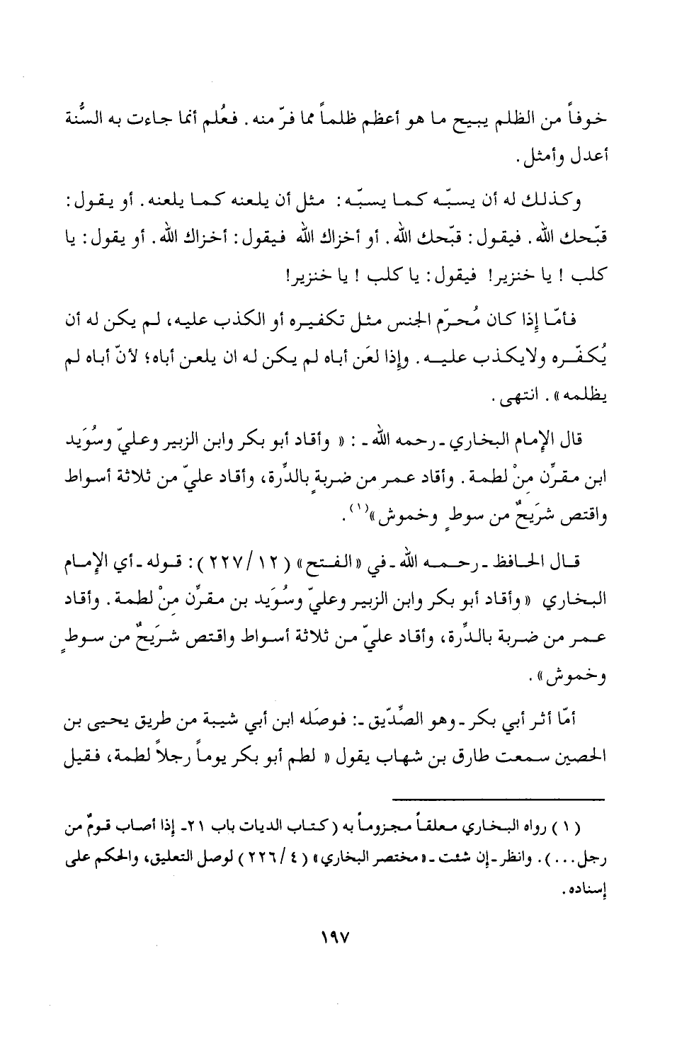 قال الحافظ -رحمه الله- في "الفتح" (12/ 227): قوله -أي الإِمام البخاري "وأقاد أبو بكر وابن الزبير وعليّ وسُوَيد بن مقرِّن مِنْ لطمة. وأقاد عمر من ضربة بالدِّرة، وأقاد عليّ من ثلاثة أسواط واقتص شرَيحٌ من سوطٍ وخموش".