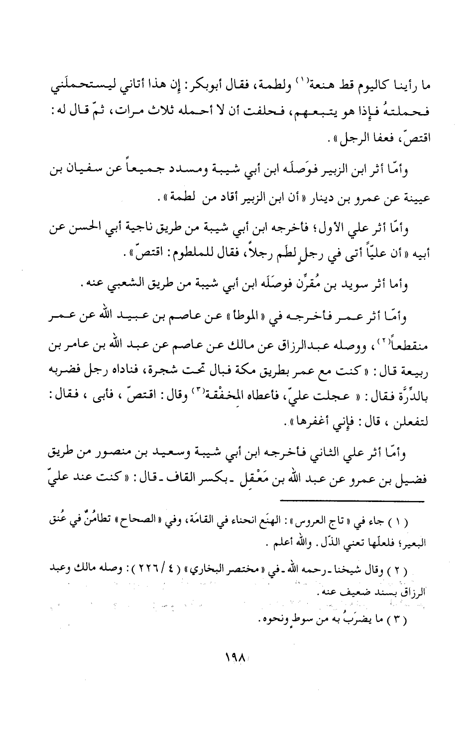 وأمّا أثر ابن الزبير فوَصلَه ابن أبي شيبة ومسدد جميعاً عن سفيان بن عيينة عن عمرو بن دينار "أن ابن الزبير أقاد من لطمة".