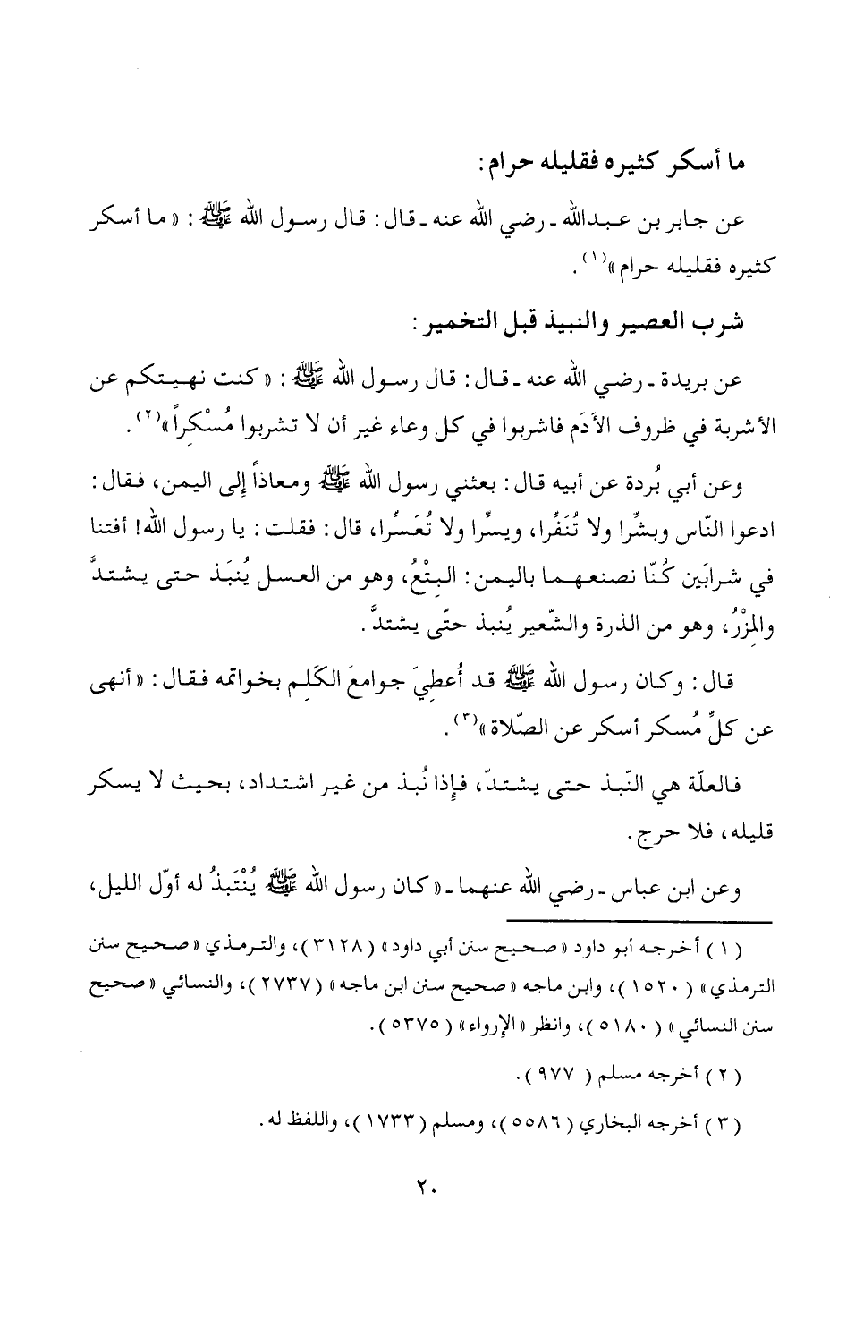 عن جابر بن عبد الله -رضي الله عنه- قال: قال رسول الله - صَلَّى اللَّهُ عَلَيْهِ وَسَلَّمَ -: "ما أسكر كثيره فقليله حرام" (¬1).