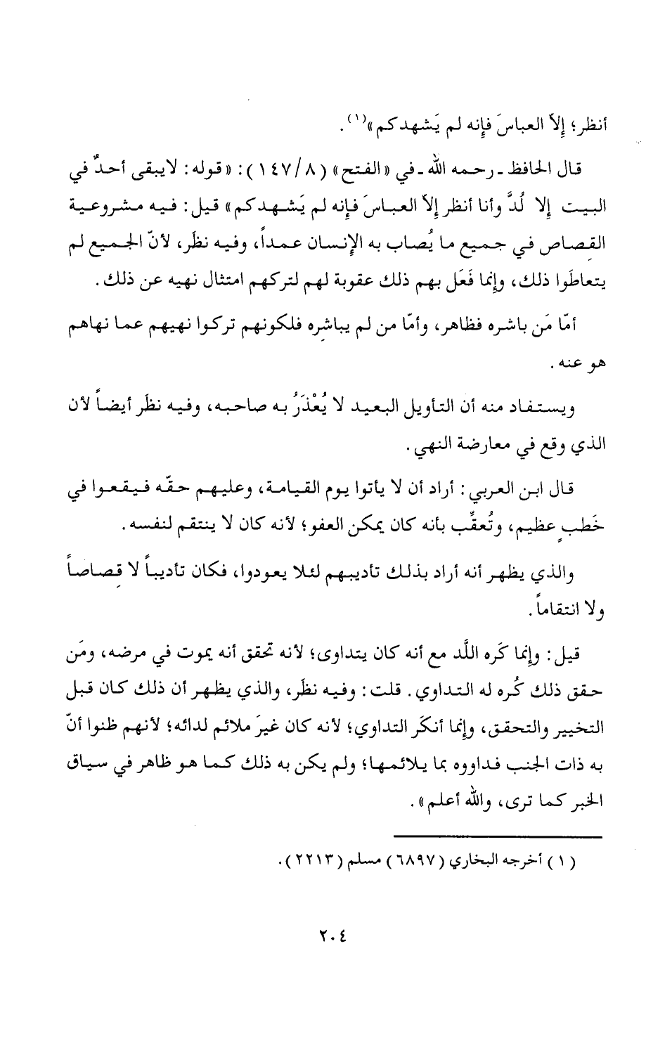 قال الحافظ -رحمه الله- في "الفتح" (8/ 147): "قوله: لا يبقى أحدٌ في البيت إِلا لُدَّ وأنا أنظر إلاَّ العباسَ فإِنه لم يَشهدكم" قيل: فيه مشروعية القِصاص في جميع ما يُصاب به الإِنسان عمداً، وفيه نظَر، لأنّ الجميع لم يتعاطَوا ذلك، وإنما فَعَل بهم ذلك عقوبة لهم لتركهم امتثال نهيه عن ذلك.