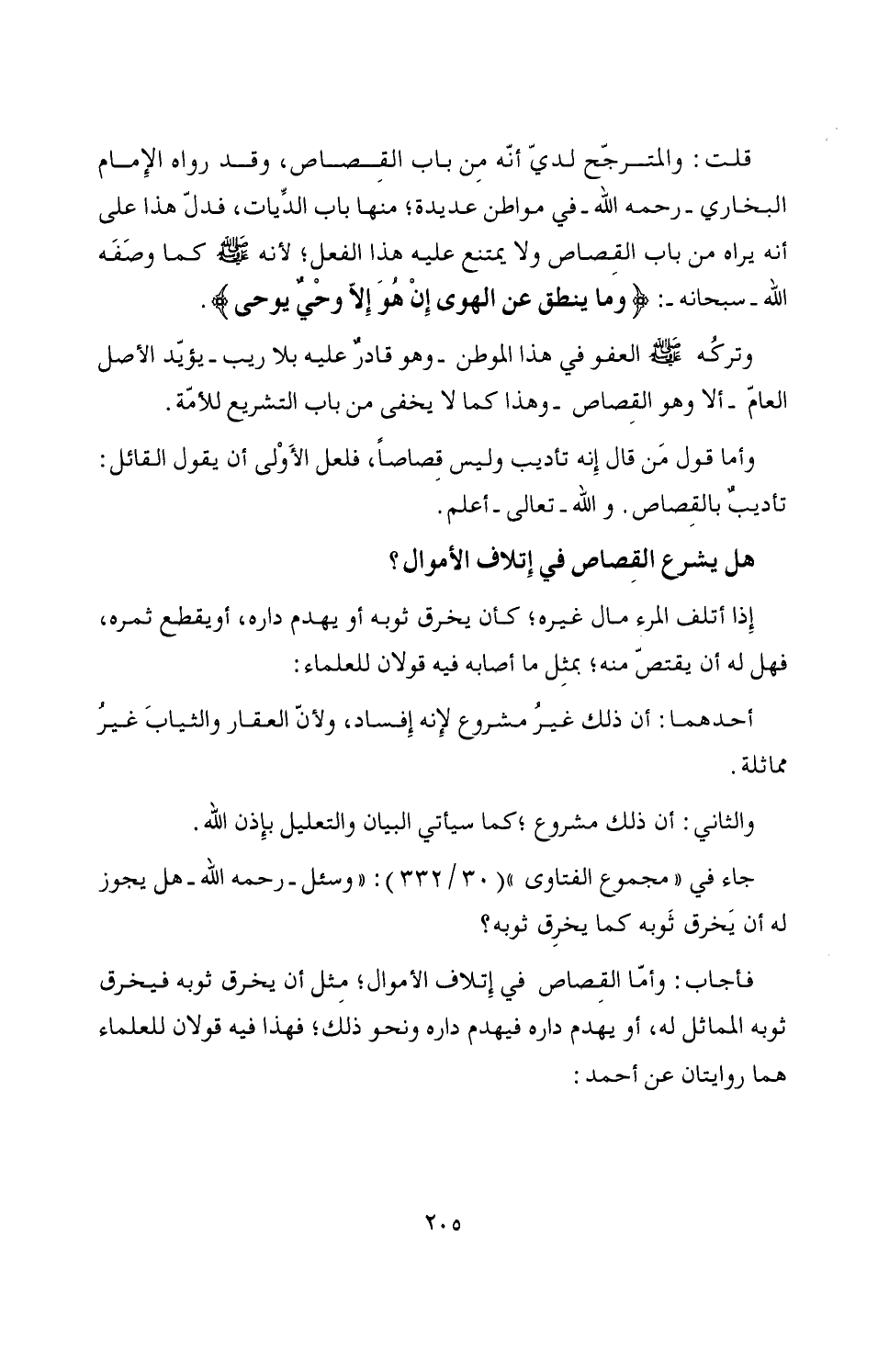فأجاب: وأمّا القِصاص في إِتلاف الأموال؛ مِثل أن يخرق ثوبه فيخرق ثوبه المماثل له، أو يهدم داره فيهدم داره ونحو ذلك؛ فهذا فيه قولان للعلماء هما روايتان عن أحمد: