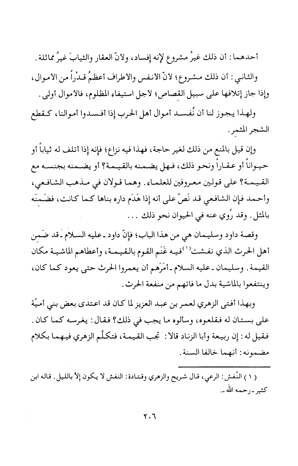 ولهذا يجوز لنا أن نُفسد أموال أهل الحرب إِذا أفسدوا أموالنا، كقطع الشجر المثمِر.