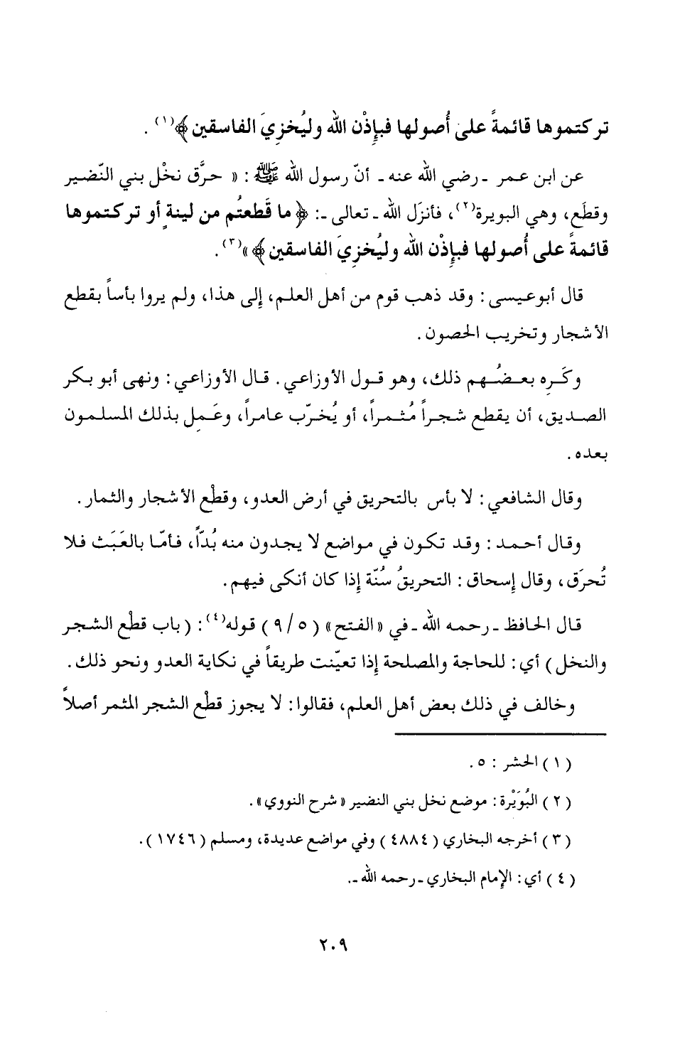 عن ابن عمر -رضي الله عنه- أنّ رسول الله - صَلَّى اللَّهُ عَلَيْهِ وَسَلَّمَ -: "حرَّق نخْل بني النّضير وقطَع، وهي البويرة (¬2)، فأنزَل الله -تعالى-: {ما قَطعتُم من لينةٍ أو تركتموها قائمةً على أُصولها فبإذن الله وليُخزِيَ الفاسقين} " (¬3).