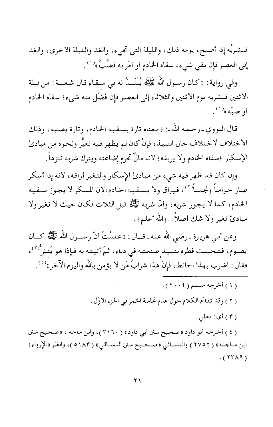 وإِن كان قد ظهر فيه شيء من مبادئ الإِسكار والتغير أراقه، لأنه إِذا أسكر صار حراماً ونجساً (¬2)، فيراق ولا يسقيه الخادم، لأن المسكر لا يجوز سقيه الخادم، كما لا يجوز شربه، وأمّا شربه - صَلَّى اللَّهُ عَلَيْهِ وَسَلَّمَ - قبل الثلاث فكان حيث لا تغير ولا مبادئ تغير ولا شك أصلاً. والله أعلم".