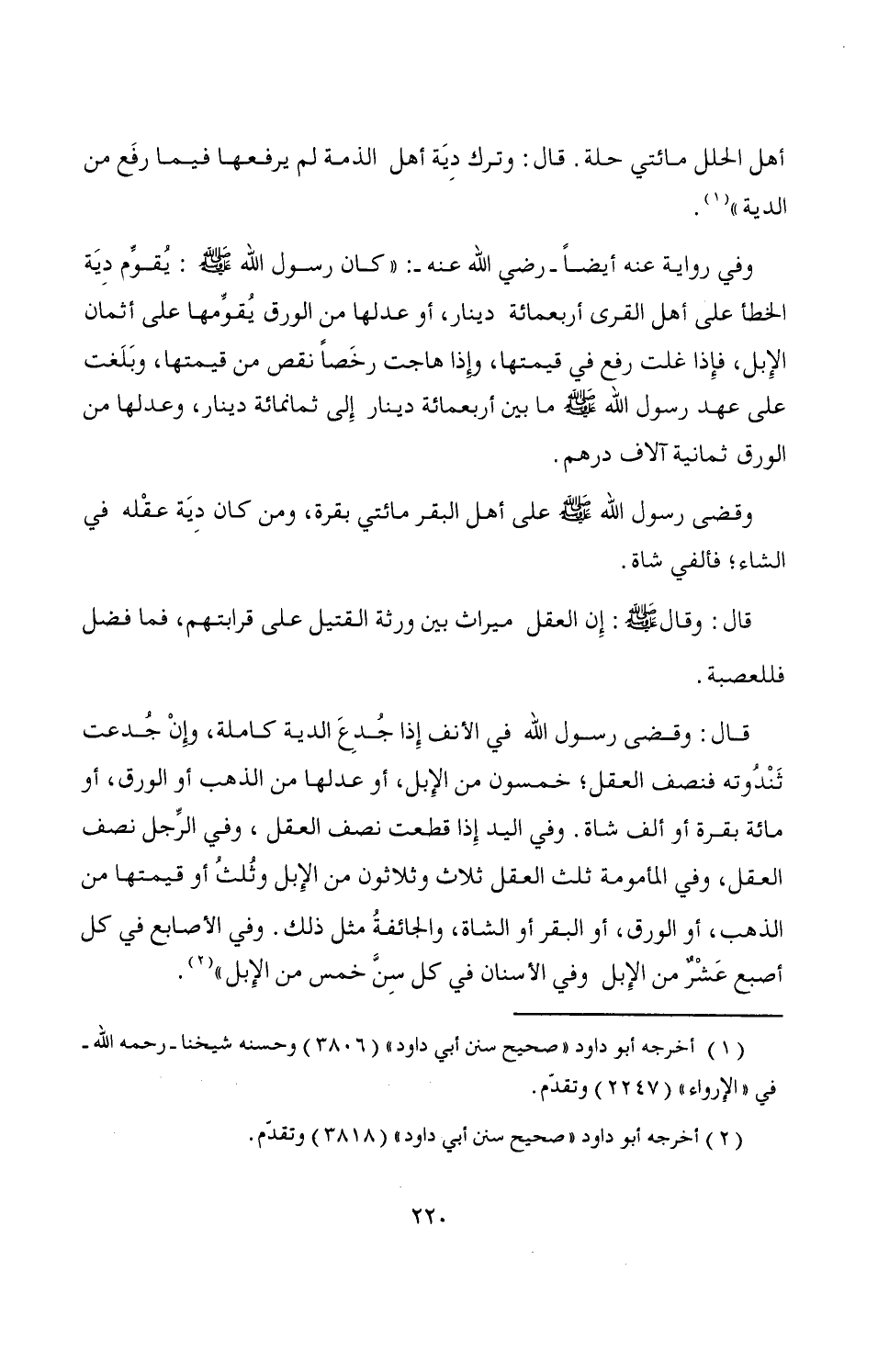 وفي رواية عنه أيضاً -رضي الله عنه-: "كان رسول الله - صَلَّى اللَّهُ عَلَيْهِ وَسَلَّمَ -: يُقوِّم دِيَة الخطأ على أهل القرى أربعمائة دينار، أو عدلها من الورق يُقوِّمها على أثمان الإِبل، فإِذا غلت رفع في قيمتها، وإذا هاجت رخَصاً نقص من قيمتها، وبَلَغت على عهد رسول الله - صَلَّى اللَّهُ عَلَيْهِ وَسَلَّمَ - ما بين أربعمائة دينار إِلى ثمانمائة دينار، وعدلها من الورق ثمانية آلاف درهم.