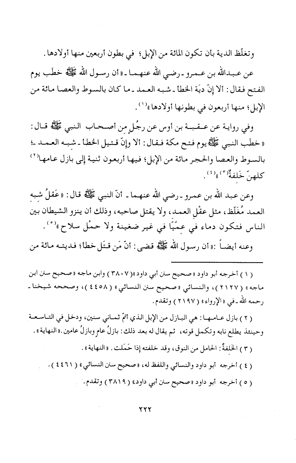 عن عبد الله بن عمرو -رضي الله عنهما- "أن رسول الله - صَلَّى اللَّهُ عَلَيْهِ وَسَلَّمَ - خطَب يوم الفتح فقال: ألا إِنّ ديَة الخطأ -شبه العمد- ما كان بالسوط والعصا مائة من الإِبل؛ منها أربعون في بطونها أولادها" (¬1).