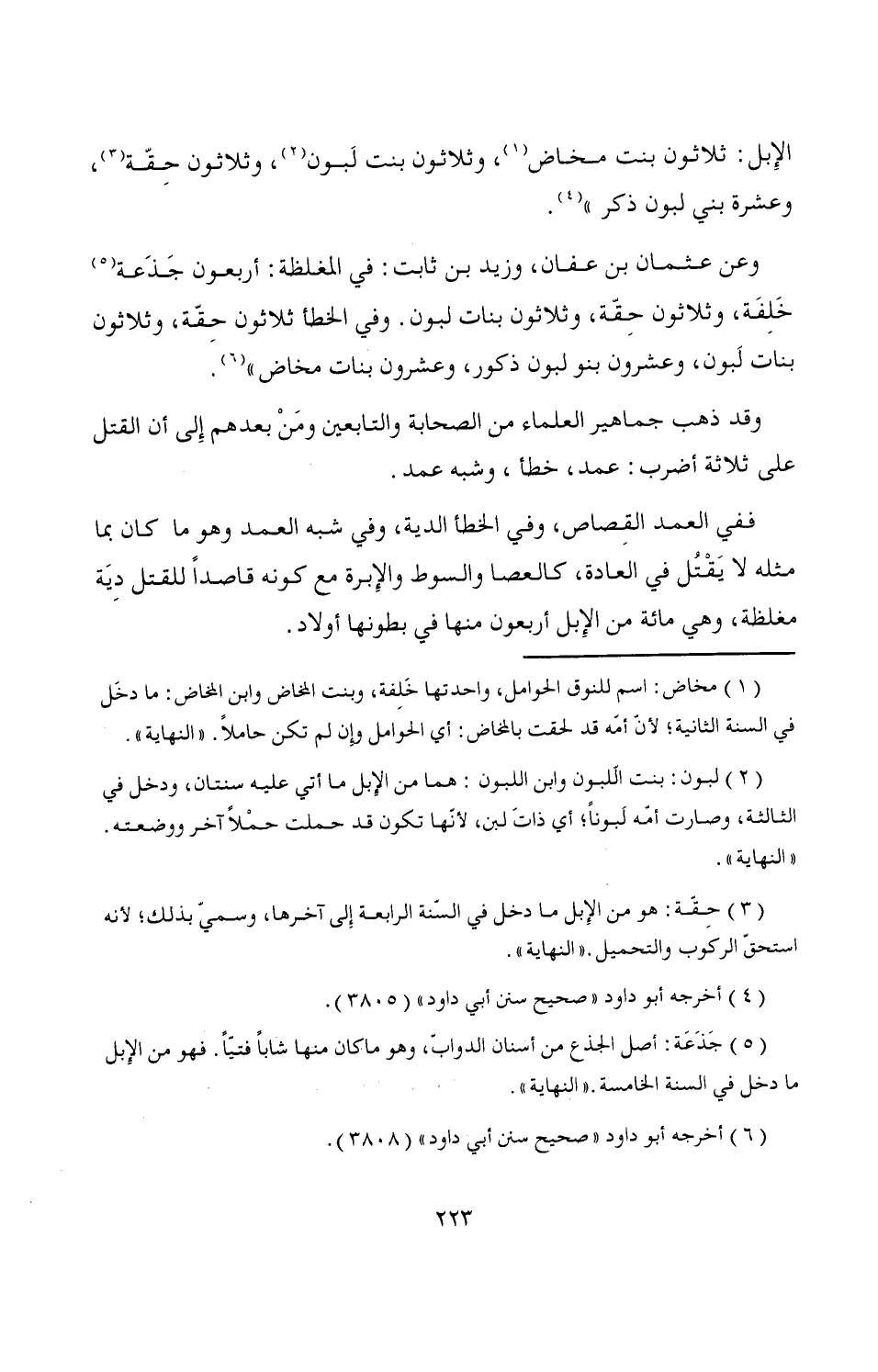 ففي العمد القِصاص، وفي الخطأ الدية، وفي شبه العمد وهو ما كان بما مثله لا يَقْتُل في العادة، كالعصا والسوط والإِبرة مع كونه قاصداً للقتل ديَة مغلظة، وهي مائة من الإِبل أربعون منها في بطونها أولاد.