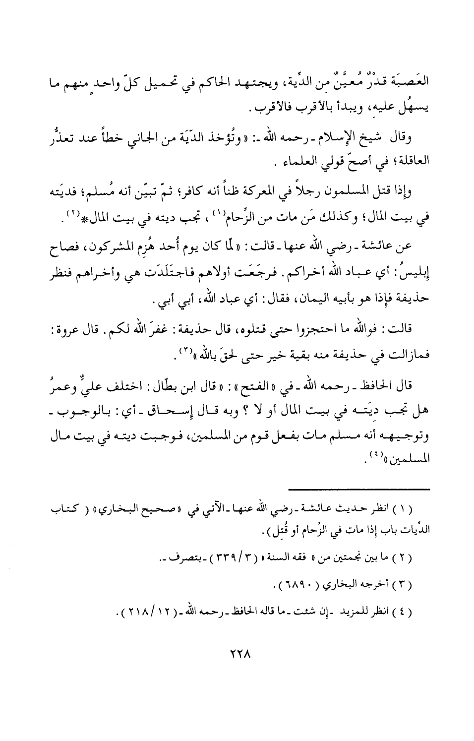 قال الحافظ -رحمه الله- في "الفتح": "قال ابن بطّال: اختلف عليٌّ وعمرُ هل تجب دِيَته في بيت المال أو لا؟ وبه قال إِسحاق -أي: بالوجوب- وتوجيهه أنه مسلم مات بفعل قوم من المسلمين، فوجبت ديته في بيت مال المسلمين" (¬4).