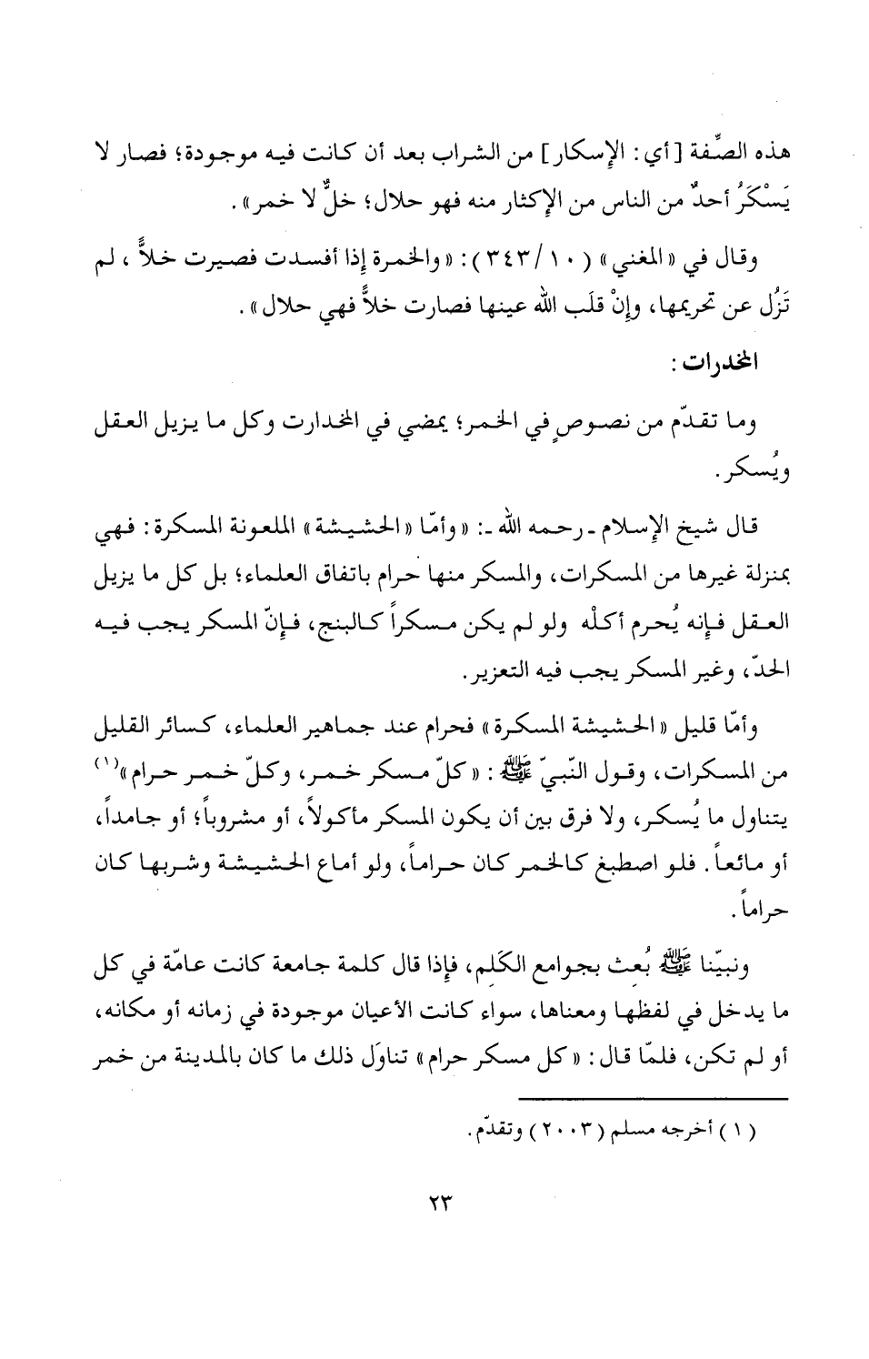 وأمّا قليل "الحشيشة المسكرة" فحرام عند جماهير العلماء، كسائر القليل من المسكرات، وقول النّبي - صَلَّى اللَّهُ عَلَيْهِ وَسَلَّمَ -: "كلّ مسكر خمر، وكلّ خمر حرام" (¬1) يتناول ما يُسكر، ولا فرق بين أن يكون المسكر مأكولاً، أو مشروباً؛ أو جامداً، أو مائعاً. فلو اصطبغ كالخمر كان حراماً، ولو أماع الحشيشة وشربها كان حراماً.