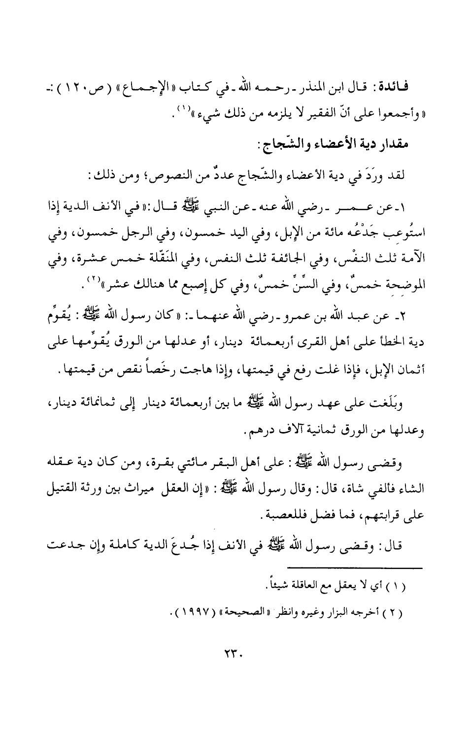 2 - عن عبد الله بن عمرو -رضي الله عنهما-: "كان رسول الله - صَلَّى اللَّهُ عَلَيْهِ وَسَلَّمَ -: يُقوِّم دية الخطأ على أهل القرى أربعمائة دينار، أو عدلها من الورق يُقوِّمها على أثمان الإِبل، فإِذا غلت رفع في قيمتها، وإذا هاجت رخَصاً نقص من قيمتها.