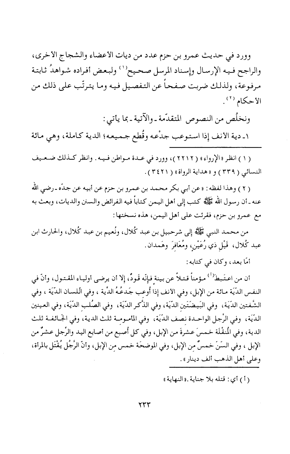 (¬2) وهذا لفظه: "عن أبي بكر محمد بن عمرو بن حزم عن أبيه عن جدّه -رضي الله عنه- أن رسول الله - صَلَّى اللَّهُ عَلَيْهِ وَسَلَّمَ - كتب إِلى أهل اليمن كتاباً فيه الفرائض والسنن والديات، وبعث به مع عمرو بن حزم، فقرئت على أهل اليمن، هذه نسختها: