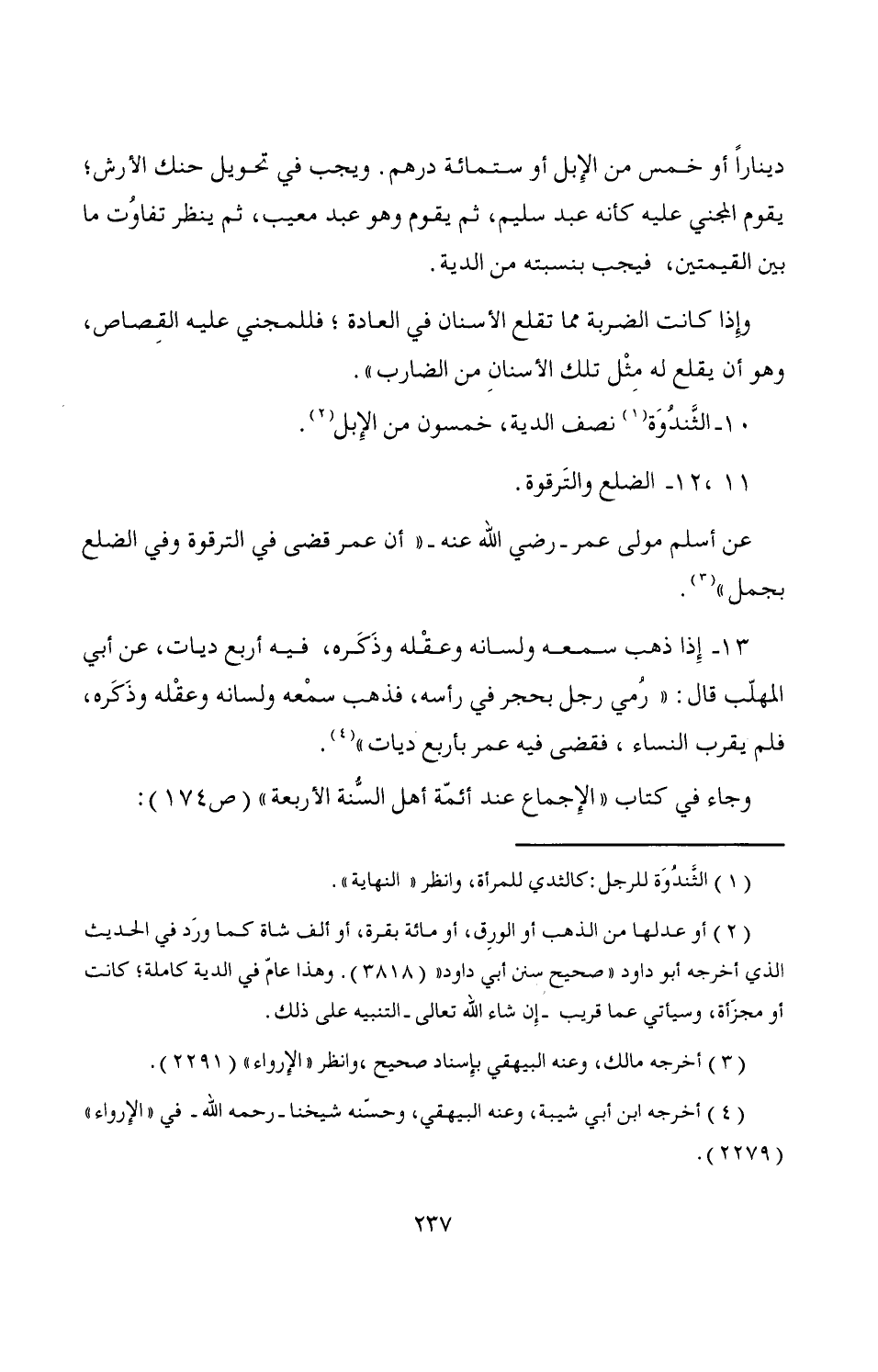 13 - إِذا ذهب سمعه ولسانه وعقْله وذَكَره، فيه أربع ديات، عن أبي المهلّب قال: "رُمي رجل بحجر في رأسه، فذهب سمْعه ولسانه وعقْله وذَكَره، فلم يقرب النساء، فقضى فيه عمر بأربع ديات" (¬4).