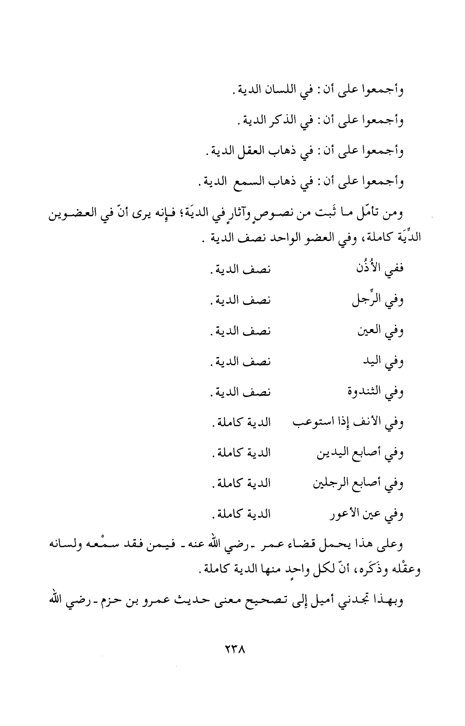 وعلى هذا يحمل قضاء عمر -رضي الله عنه- فيمن فقد سمْعه ولسانه وعقْله وذَكَره، أنّ لكل واحدٍ منها الدية كاملة.