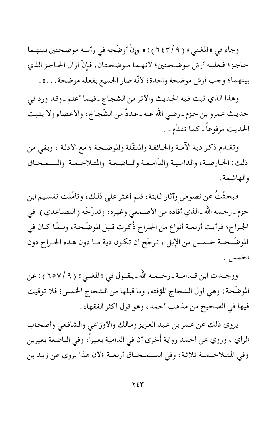 فبحثتُ عن نصوصٍ وآثار ثابتة، فلم أعثر على ذلك، وتأمّلت تقسيم ابن حزم -رحمه الله- الذي أفاده من الأصمعي وغيره، وتدرّجَه (التصاعدي) في الجراح؛ فرأيت أربعة أنواع من الجراح ذُكرت قبل الموضّحة، ولمّا كان في الموضّحة خمس من الإبل، ترجّح أن تكون دية ما دون هذه الجراح دون الخمس.