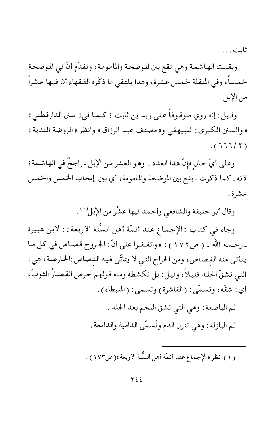 وبقيت الهاشمة وهي تقع بين الموضحة والمأمومة، وتقدّم أنّ في الموضحة خمساً، وفي المنقلة خمس عشرة، وهذا يلتقي ما ذكَره الفقهاء أن فيها عشراً من الإِبل.