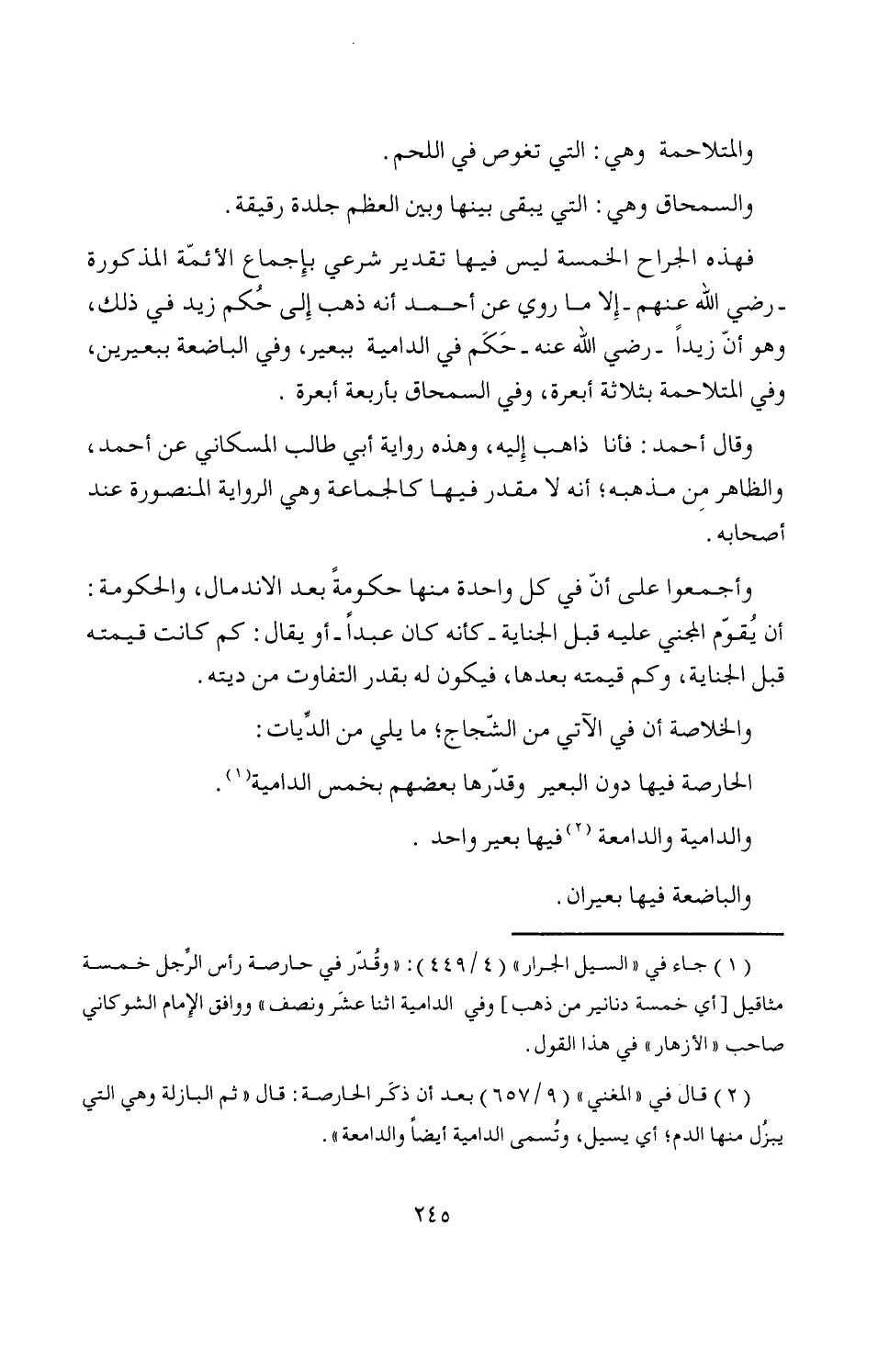 (¬1) جاء في "السيل الجرار" (4/ 449): "وقُدّر في حارصة رأس الرِّجل خمسة مثاقيل [أي خمسة دنانير من ذهب] وفي الدامية اثنا عشَر ونصف" ووافق الإمام الشوكاني صاحب "الأزهار" في هذا القول.