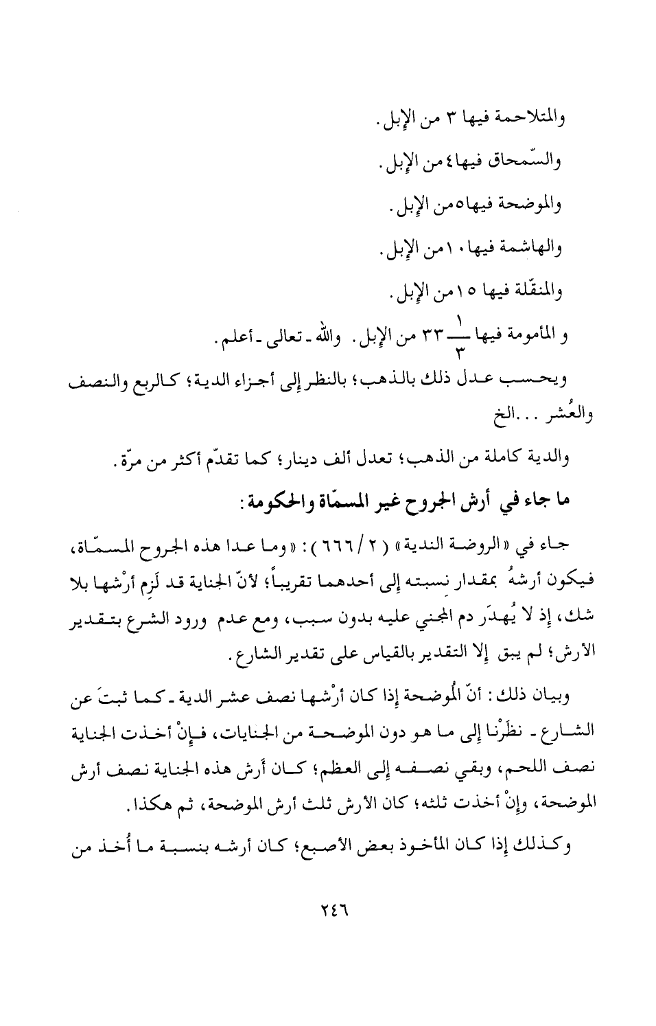 جاء في "الروضة الندية" (2/ 666): "وما عدا هذه الجروح المسمّاة، فيكون أرشهُ بمقدار نِسبته إِلى أحدهما تقريباً؛ لأنّ الجناية قد لَزِم أرْشها بلا شك، إِذ لا يُهدَر دم المجني عليه بدون سبب، ومع عدم ورود الشرع بتقدير الأرش؛ لم يبق إِلا التقدير بالقياس على تقدير الشارع.