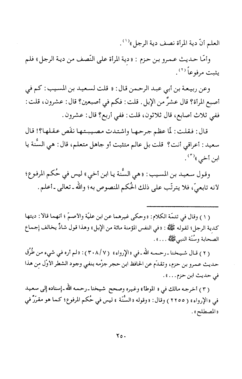 وأمّا حديث عمرو بن حزم: "دِية المرأة على النّصف من دية الرجل" فلم يثبت مرفوعاً (¬2).
