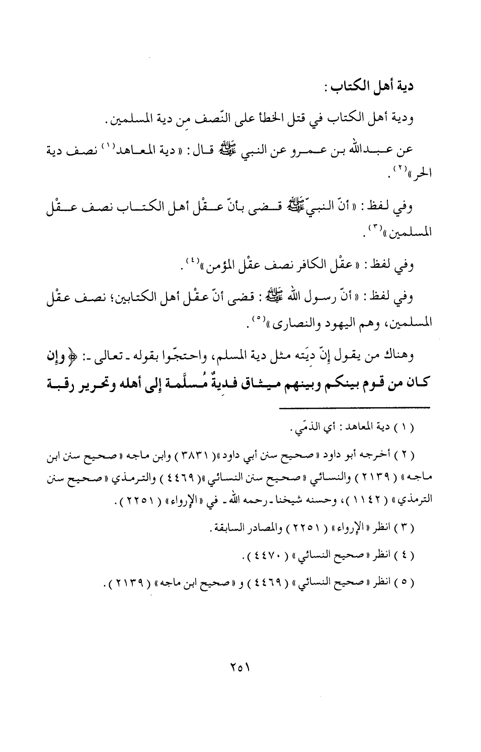 وفي لفظ: "أنّ رسول الله - صَلَّى اللَّهُ عَلَيْهِ وَسَلَّمَ -: قضى أنّ عقْل أهل الكتابين؛ نصف عقْل المسلمين، وهم اليهود والنصارى" (¬5).