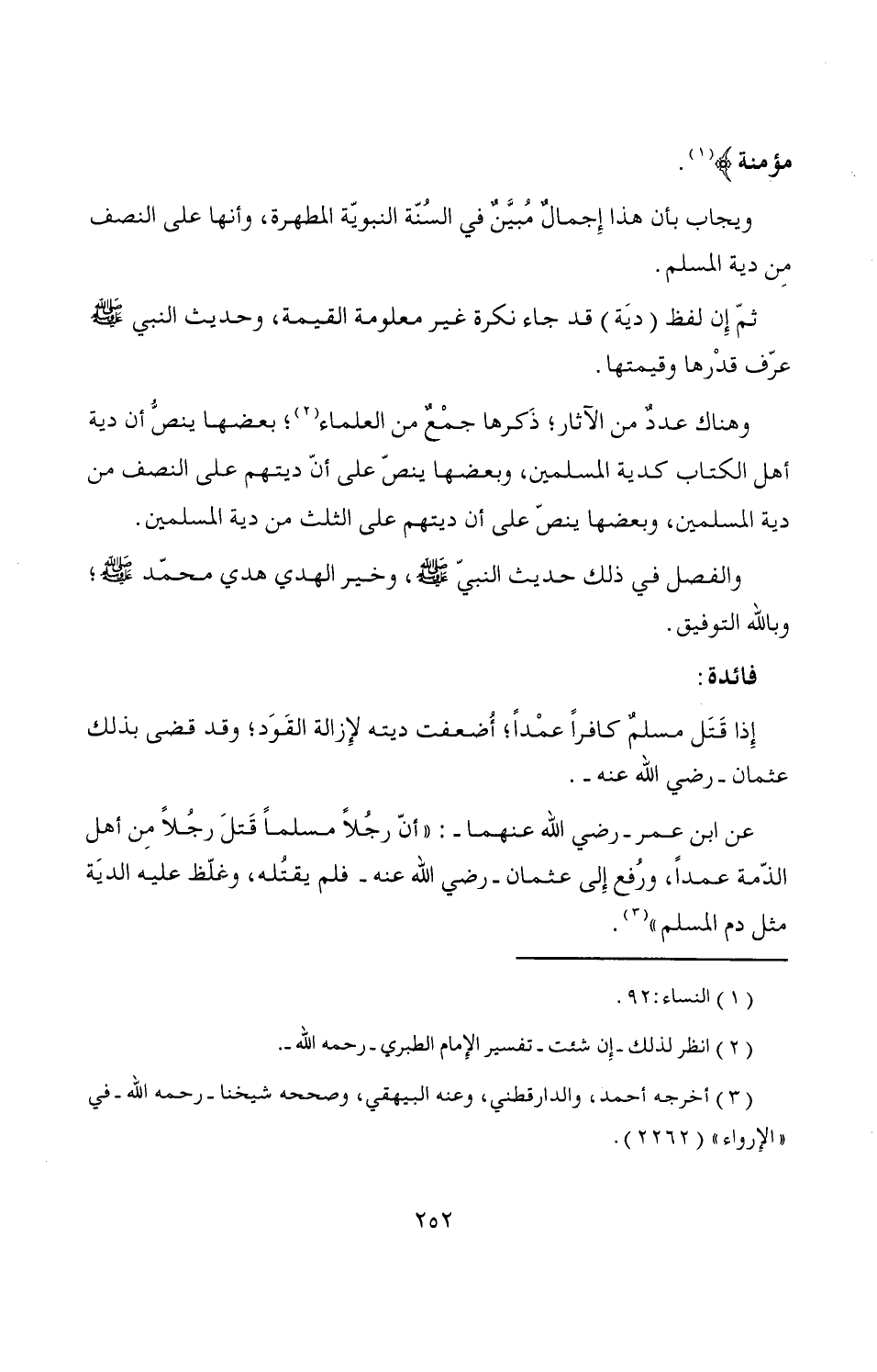 وهناك عددٌ من الآثار؛ ذَكرها جمْعٌ من العلماء (¬2)؛ بعضها ينصُّ أن دية أهل الكتاب كدية المسلمين، وبعضها ينصّ على أنّ ديتهم على النصف من دية المسلمين، وبعضها ينصّ على أن ديتهم على الثلث من دية المسلمين.