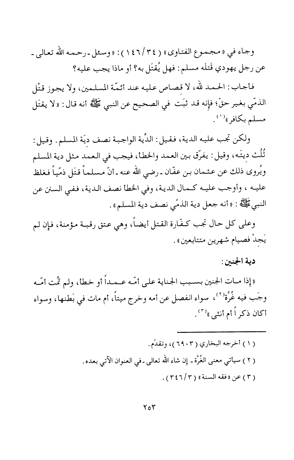 وجاء في "مجموع الفتاوى" (34/ 146): "وسئل -رحمه الله تعالى- عن رجل يهودي قَتلَه مسلم: فهل يُقتَل به؟ أو ماذا يجب عليه؟