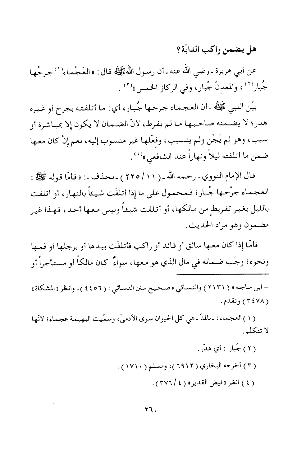 بيّن النبي - صَلَّى اللَّهُ عَلَيْهِ وَسَلَّمَ - أن العجماء جرحها جُبار، أي: ما أتلفته بجرح أو غيره هدر، لا يضمنه صاحبها ما لم يفرط، لأنّ الضمان لا يكون إِلا بمباشرة أو سبب، وهو لم يَجْن ولم يتسبب، وفِعْلها غير منسوب إِليه، نعم إِنْ كان معها ضمن ما أتلفته ليلاً ونهاراً عند الشافعي" (¬4).