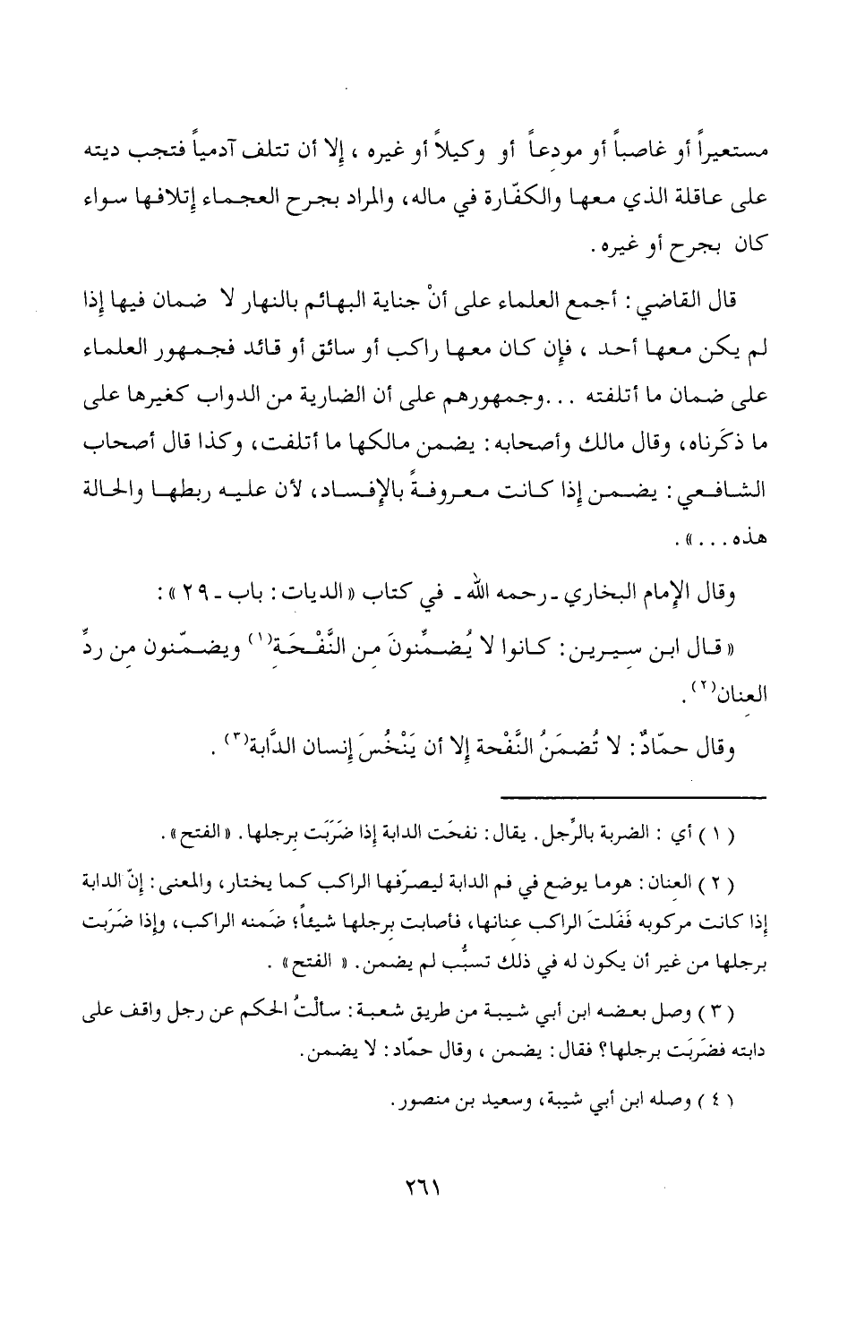 (¬2) العِنان: هو ما يوضع في فم الدابة ليصرّفها الراكب كما يختار، والمعنى: إِنّ الدابة إِذا كانت مركوبه فَفَلتَ الراكب عِنانها، فأصابت بِرجلها شيئاً؛ ضَمنه الراكب، وإذا ضَرَبت برجلها من غير أن يكون له في ذلك تسبُّب لم يضمن. "الفتح".