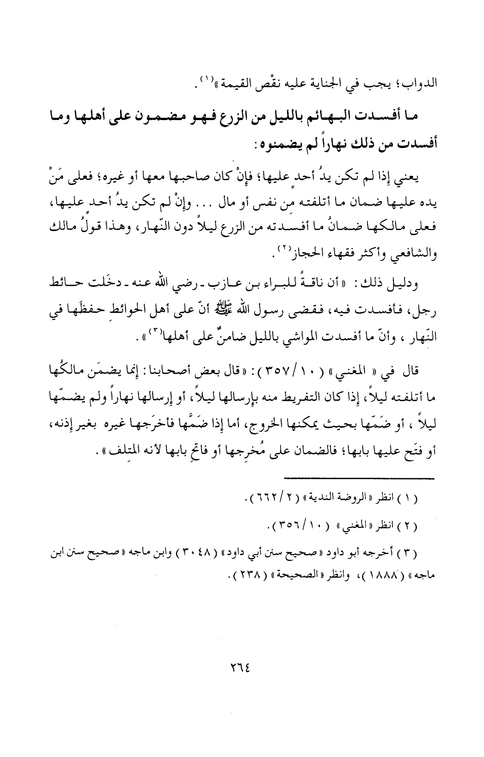 ودليل ذلك: "أن ناقةً للبراء بن عازب -رضي الله عنه- دخَلت حائط رجل، فأفسدت فيه، فقضى رسول الله - صَلَّى اللَّهُ عَلَيْهِ وَسَلَّمَ - أنّ على أهل الحوائطِ حفظَها في النّهار، وأنّ ما أفسدت المواشي بالليل ضامنٌ على أهلها (¬3) ".