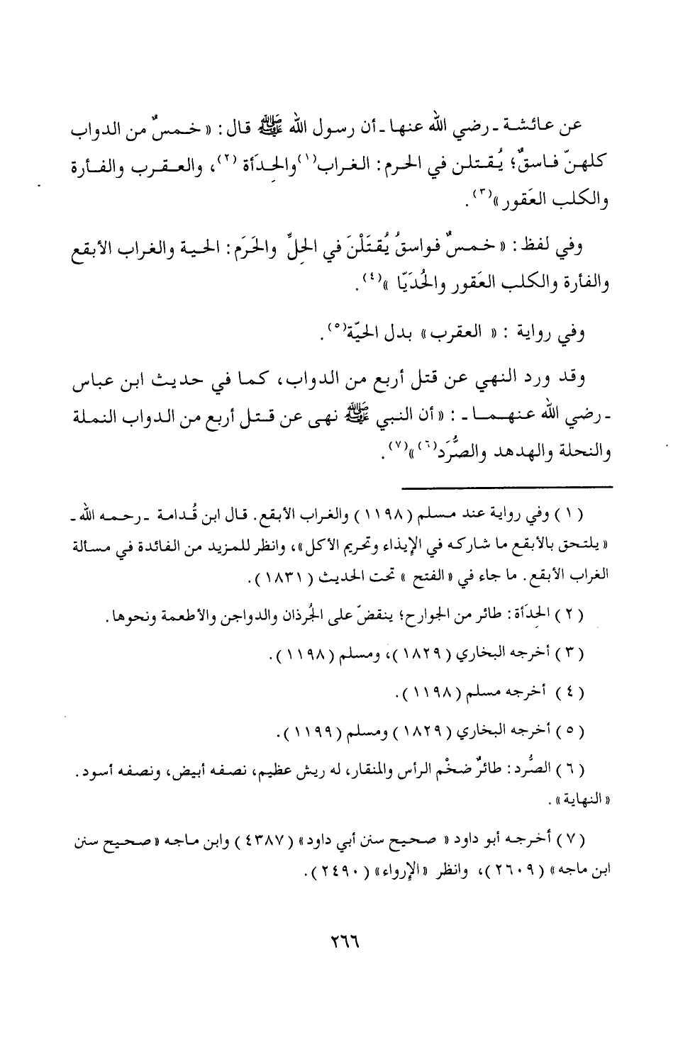 (¬1) وفي رواية عند مسلم (1198) والغراب الأبقع. قال ابن قُدامة -رحمه الله- "يلتحق بالأبقع ما شاركه في الإيذاء وتحريم الأكل"، وانظر للمزيد من الفائدة في مسألة الغراب الأبقع. ما جاء في "الفتح" تحت الحديث (1831).