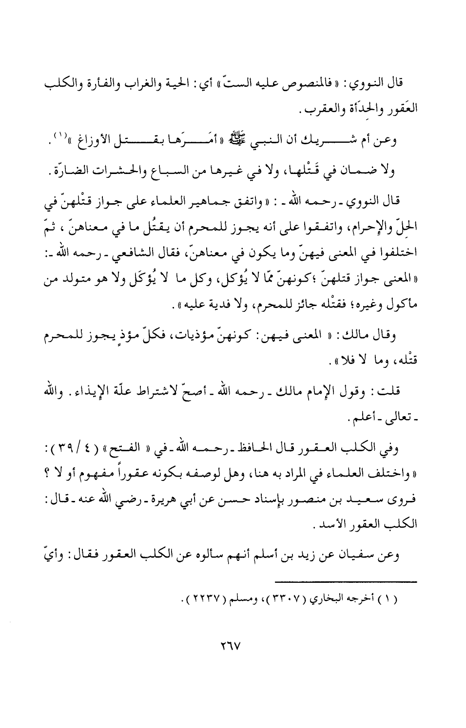قال النووي -رحمه الله-: "واتفق جماهير العلماء على جواز قتْلهنّ في الحِلّ والإِحرام، واتفقوا على أنه يجوز للمحرم أن يقتُل ما في معناهنّ، ثمّ اختلفوا في المعنى فيهنّ وما يكون في معناهنّ، فقال الشافعي -رحمه الله-: "المعنى جواز قتلهنّ؛ كونهنّ ممّا لا يُؤكل، وكل ما لا يُؤكَل ولا هو متولد من مأكول وغيره؛ فقتْله جائز للمحرم، ولا فدية عليه".