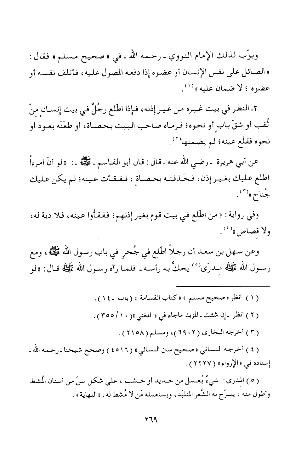 عن أبي هريرة -رضي الله عنه- قال: قال أبو القاسم - صَلَّى اللَّهُ عَلَيْهِ وَسَلَّمَ -: "لو أنّ امرءاً اطلع عليك بغير إِذن، فحَذفته بحصاةٍ، ففقأت عينه؛ لم يكن عليك جُناح" (¬3).
