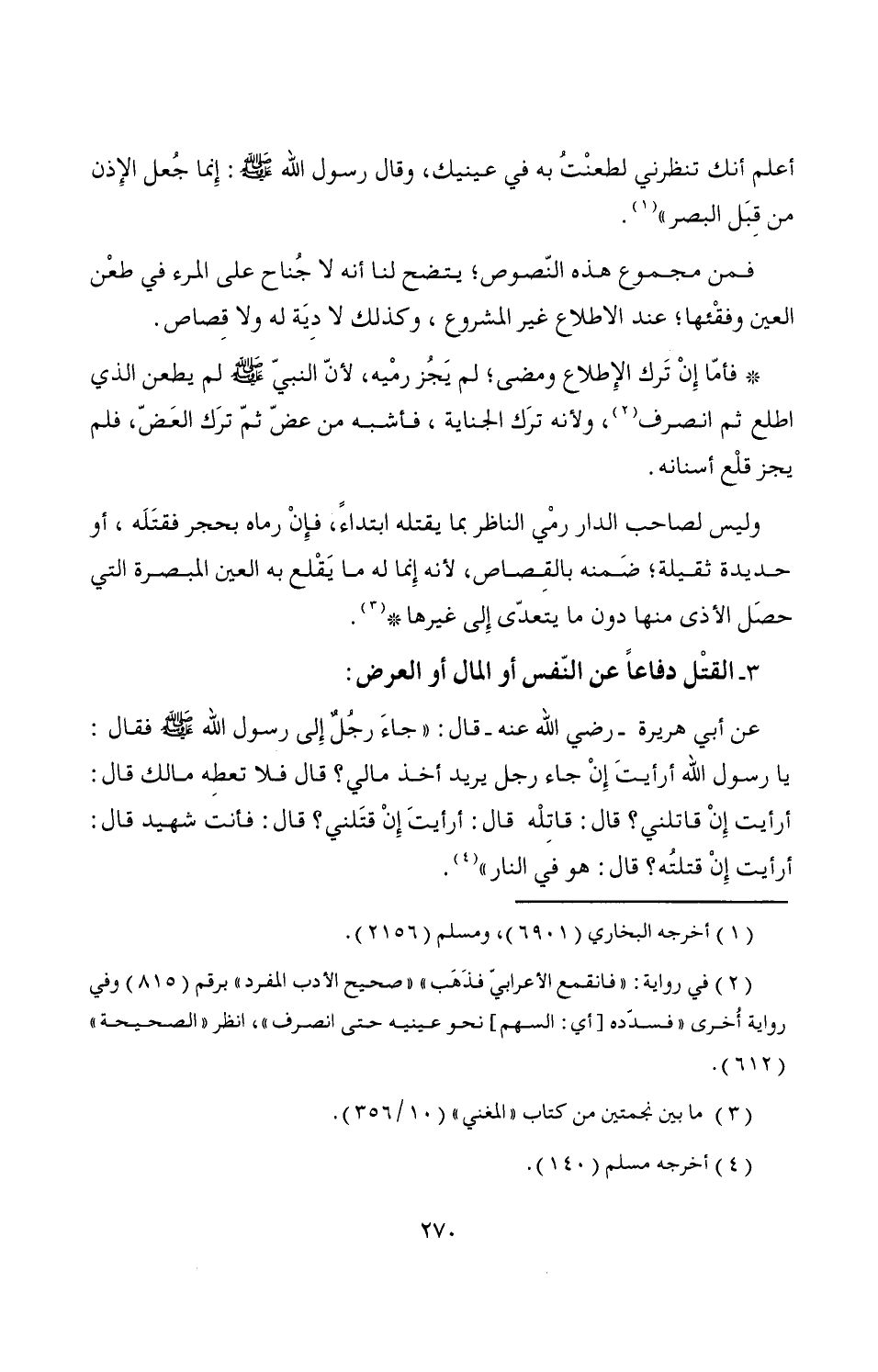 عن أبي هريرة -رضي الله عنه- قال: "جاءَ رجُلٌ إِلى رسول الله - صَلَّى اللَّهُ عَلَيْهِ وَسَلَّمَ - فقال: يا رسول الله أرأيتَ إِنْ جاء رجل يريد أخذ مالي؟ قال فلا تعطِه مالك قال: أرأيت إِنْ قاتلني؟ قال: قاتِلْه قال: أرأيتَ إِنْ قتَلني؟ قال: فأنت شهيد قال: أرأيت إِنْ قتلتُه؟ قال: هو في النار" (¬4).
