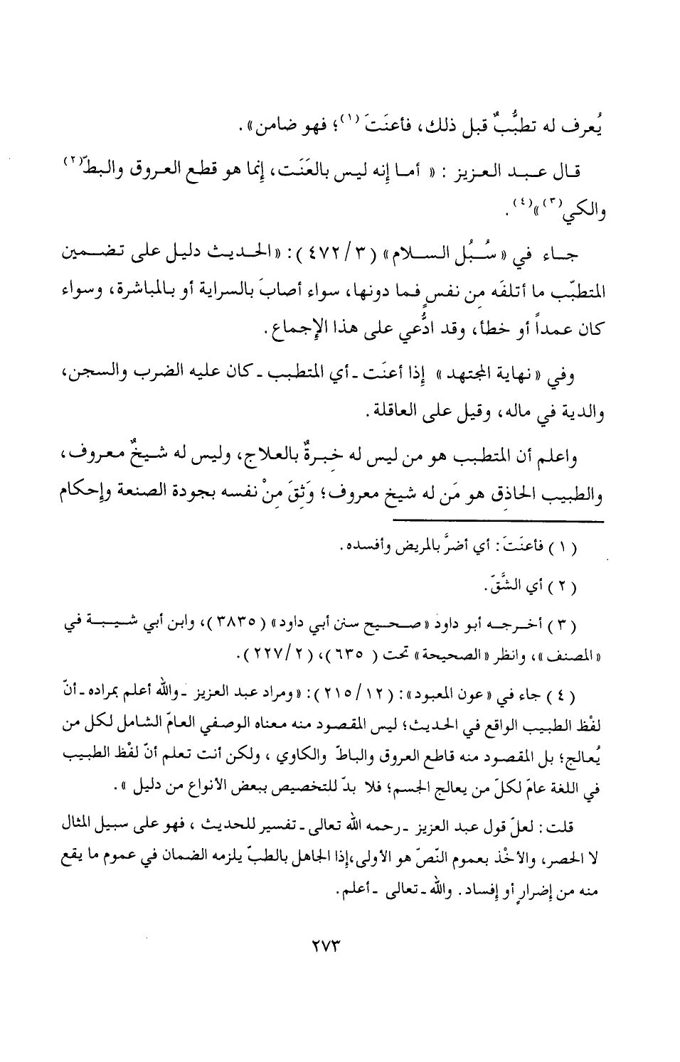 قلت: لعلّ قول عبد العزيز -رحمه الله تعالى- تفسير للحديث، فهو على سبيل المثال لا الحصر، والأخْذ بعموم النصّ هو الأولى، إذا الجاهل بالطبّ يلزمه الضمان في عموم ما يقع منه من إِضرارٍ أو إِفساد. والله -تعالى- أعلم.