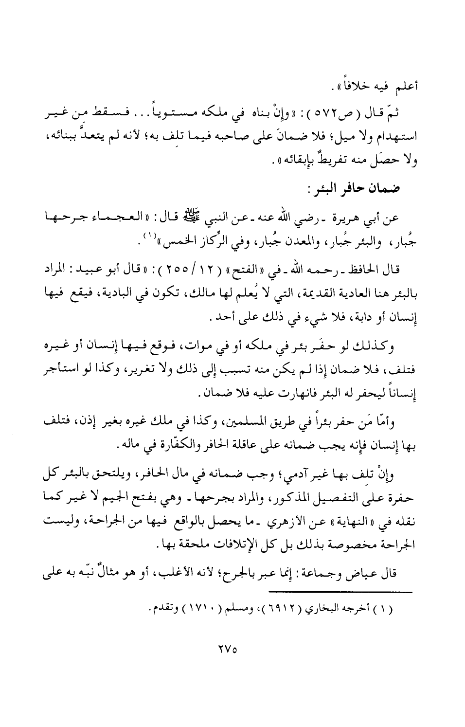 وإِنْ تلف بها غير آدمي؛ وجب ضمانه في مال الحافر، ويلتحق بالبئر كل حفرة على التفصيل المذكور، والمراد بجرحها -وهي بفتح الجيم لا غير كما نقله في "النهاية" عن الأزهري- ما يحصل بالواقع فيها من الجراحة، وليست الجراحة مخصوصة بذلك بل كل الإِتلافات ملحقة بها.