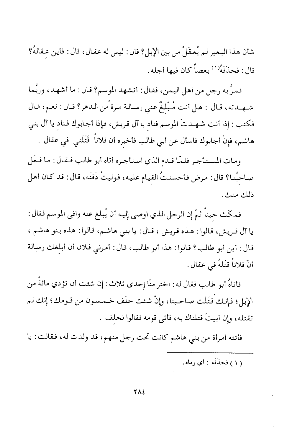 فأتاهُ أبو طالب فقال له: اختر منّا إِحدى ثلاث: إِن شئت أن تؤدي مائةً من الإبل؛ فإِنك قتَلْت صاحبنا، وإنْ شئت حلَف خمسون من قومك؛ إِنك لم تقتله، وإِن أبيتَ قتلناك به، فأتى قومه فقالوا نحلِف.