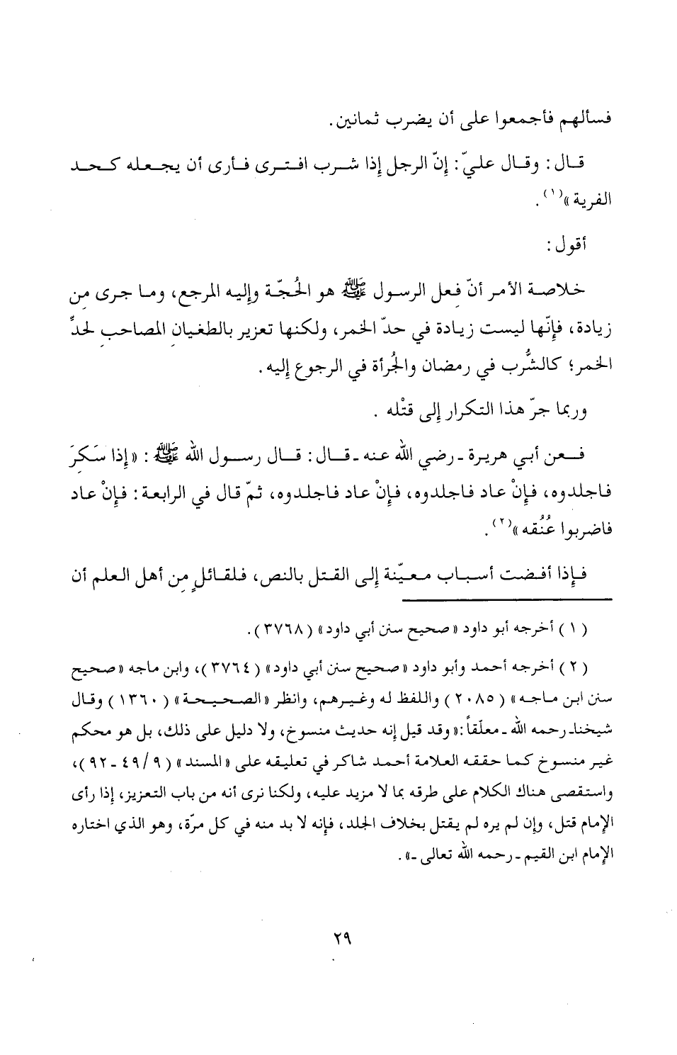 (¬2) أخرجه أحمد وأبو داود "صحيح سنن أبي داود" (3764)، وابن ماجه "صحيح سنن ابن ماجه" (2085) واللفظ له وغيرهم، وانظر "الصحيحة" (1360) وقال شيخنا -رحمه الله- معلّقاً: "وقد قيل إِنه حديث منسوخ، ولا دليل على ذلك، بل هو محكم غير منسوخ كما حققه العلامة أحمد شاكر في تعليقه على "المسند" (9/ 49 - 92)، واستقصى هناك الكلام على طرقه بما لا مزيد عليه، ولكنا نرى أنه من باب التعزيز، إِذا رأى الإِمام قتل، وإن لم يره لم يقتل بخلاف الجلد، فإنه لا بد منه في كل مرّة، وهو الذي اختاره الإِمام ابن القيم -رحمه الله تعالى-".