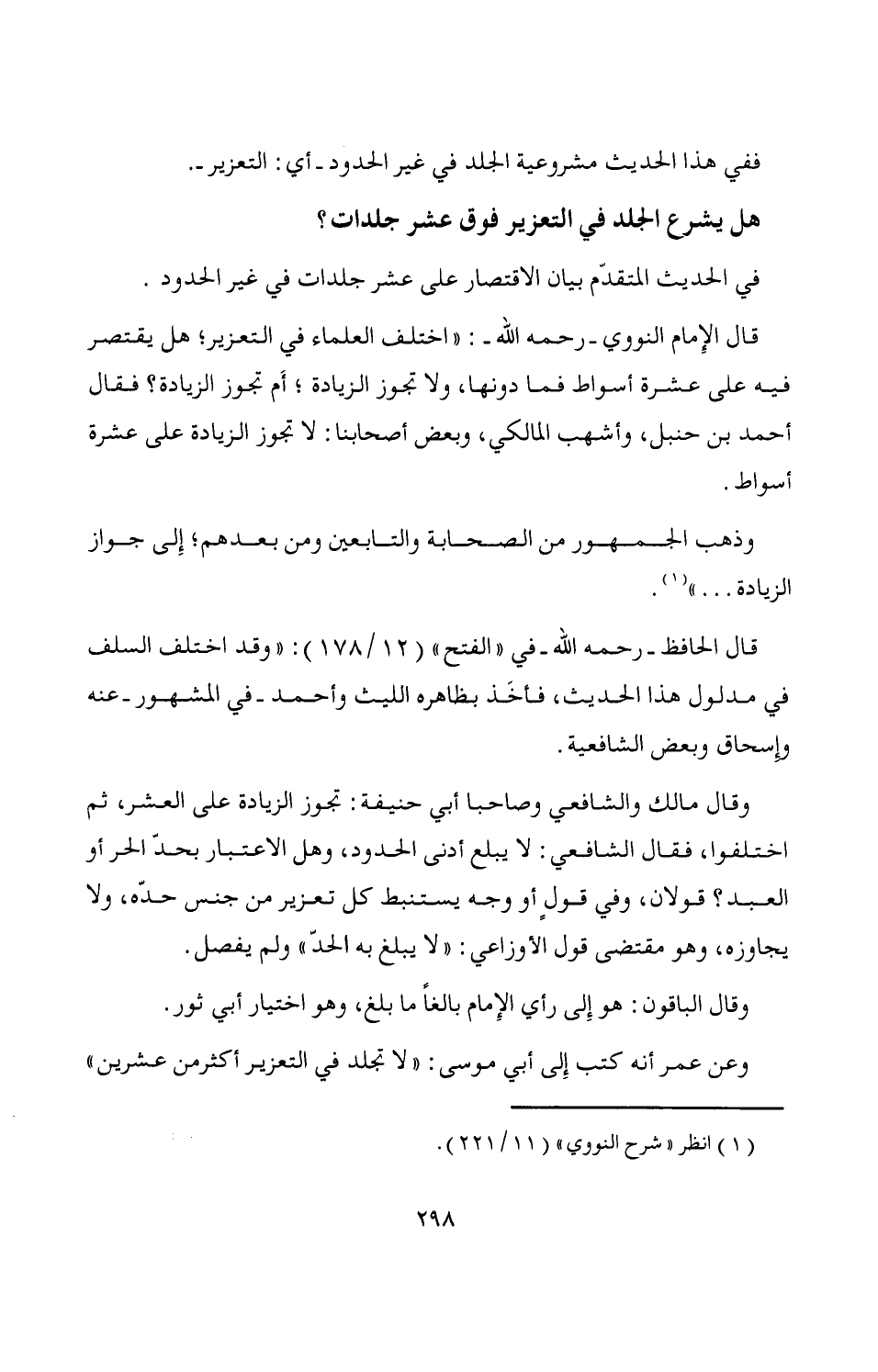 قال الإِمام النووي -رحمه الله-: "اختلف العلماء في التعزير؛ هل يقتصر فيه على عشرة أسواط فما دونها، ولا تجوز الزيادة؛ أَم تجوز الزيادة؟ فقال أحمد بن حنبل، وأشهب المالكي، وبعض أصحابنا: لا تجوز الزيادة على عشرة أسواط.