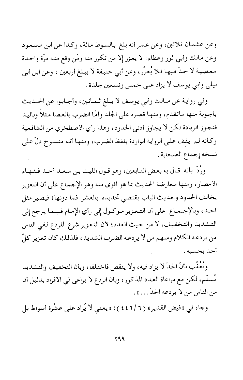 وفي رواية عن مالك وأبي يوسف لا يبلغ ثمانين، وأجابوا عن الحديث بأجوبة منها ما تقدم، ومنها قصره على الجلد وأمّا الضرب بالعصا مثلاً وباليد فتجوز الزيادة لكن لا يجاوز أدنى الحدود، وهذا رأي الأصطخري من الشافعية وكأنه لم يقِف على الرواية الواردة بلفظ الضرب، ومنها أنه منسوخ دلّ على نسخه إِجماع الصحابة.