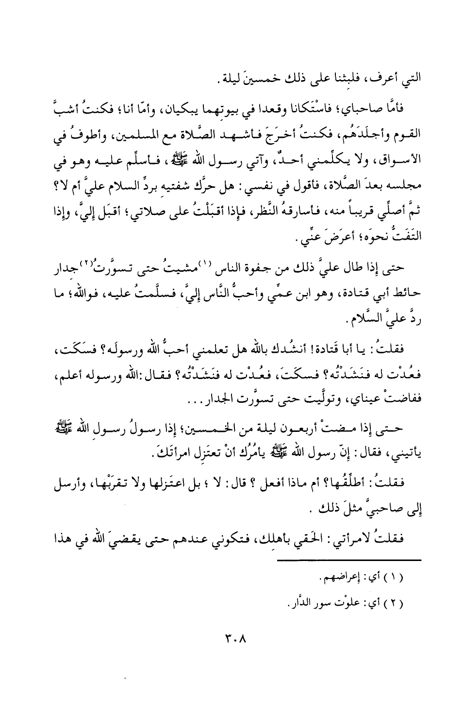 فأمَّا صاحباي؛ فاسْتَكانا وقعدا في بيوتِهما يبكيان، وأمّا أنا؛ فكنتُ أشبَّ القوم وأجلَدَهُم، فكنتُ أخرجَ فأشهد الصَّلاة مع المسلمين، وأطوفُ في الأسواق، ولا يكلِّمني أحدٌ، وآتي رسول الله - صَلَّى اللَّهُ عَلَيْهِ وَسَلَّمَ -، فأسلِّم عليه وهو في مجلسه بعدَ الصَّلاة، فأقول في نفسي: هل حرَّك شفتيهِ بردِّ السلام عليَّ أم لا؟ ثمَّ أصلِّي قريباً منه، فأسارقهُ النَّظر، فإِذا أقبَلْتُ على صلاتي؛ أقبَل إِليَّ، وإذا التَفَتُّ نحوَه؛ أعرَضَ عنِّي.