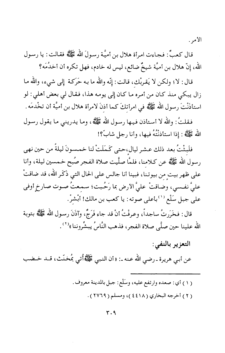 فلَبِثْتُ بعد ذلك عشر ليالٍ، حتى كَمَلَتْ لنا خمسونَ ليلةً من حين نهى رسول الله - صَلَّى اللَّهُ عَلَيْهِ وَسَلَّمَ - عن كلامِنا، فلمَّا صلَّيت صلاة الفجر صُبح خمسين ليلة، وأنا على ظهر بيتٍ مِن بيوتنا، فبينا أنا جالس على الحال التي ذَكَر الله، قد ضاقتْ عليَّ نفسي، وضاقتْ عليَّ الأرض بما رَحُبت؛ سمِعتُ صوت صارخٍ أوفى على جبل سَلْع (¬1) بأعلى صوته: يا كعب بن مالك! أبْشِرْ.