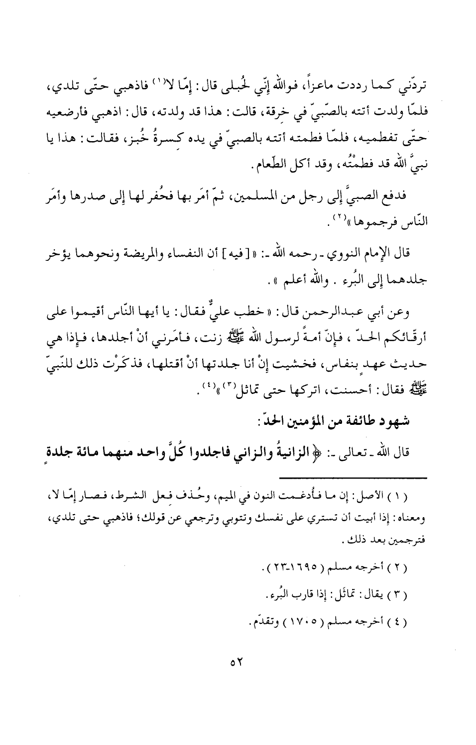 فدفع الصبيَّ إِلى رجل من المسلمين، ثمّ أمَر بها فحُفر لها إِلى صدرها وأمَر النّاس فرجموها" (¬2).