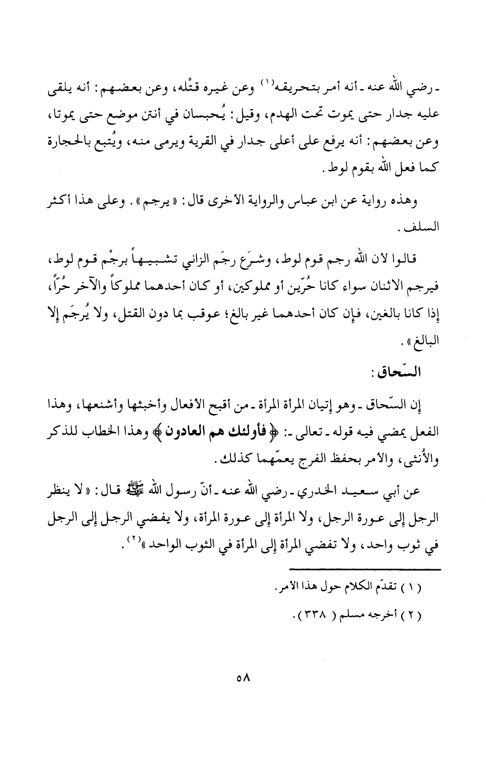 إِن السّحاق -وهو إِتيان المرأة المرأة- من أقبح الأفعال وأخبثها وأشنعها، وهذا الفعل يمضي فيه قوله -تعالى-: {فأولئك هم العادون} وهذا الخطاب للذكر والأنثى، والأمر بحفظ الفرج يعمّهما كذلك.